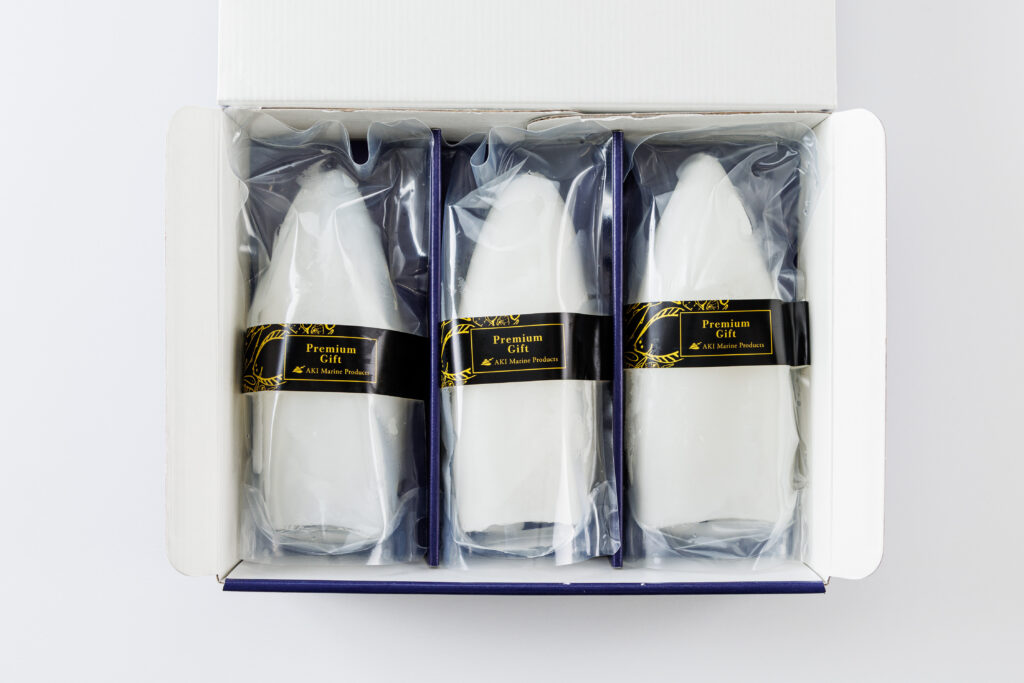 今回ご紹介いただいたのは、ギフト用のあおりいかむき身ですが、あき水産魚活部ではご自宅でも使えるパックも販売しております。