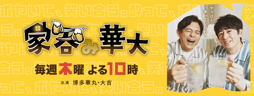 居酒屋ではなく、家呑みだからこそ出るリラックスした博多華丸・大吉の楽しいひとときを覗き見する番組です。