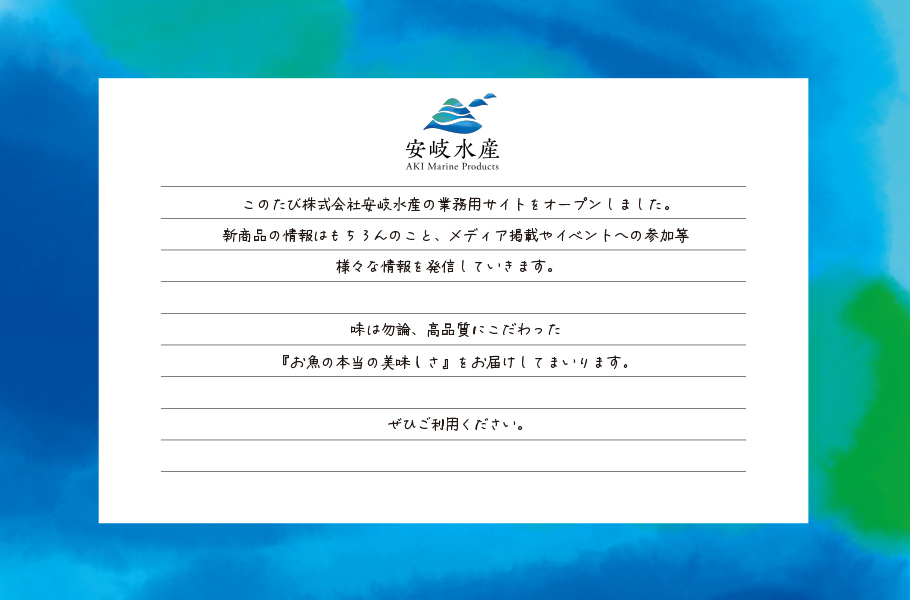 このたび株式会社安岐水産の業務用サイトをオープンしました。新商品の情報はもちろんのこと、メディア掲載やイベントへの参加等、様々な情報を発信していきます。味は勿論、高品質にこだわった『お魚の本当の美味しさ』をお届けしてまいります。ぜひご利用ください。